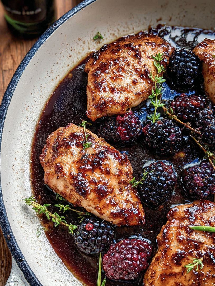 Transfer to plates and drizzle generously with the Blackberry Chicken sauce for the perfect finishing touch. Garnish with fresh blackberries and a sprig of thyme for added visual appeal. Serve with your favorite sides, such as mashed potatoes, rice, or roasted vegetables.