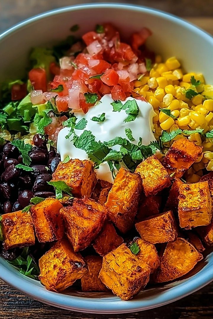 Grilled Chicken Power Bowl with Tzatziki and Sweet Potato Fries