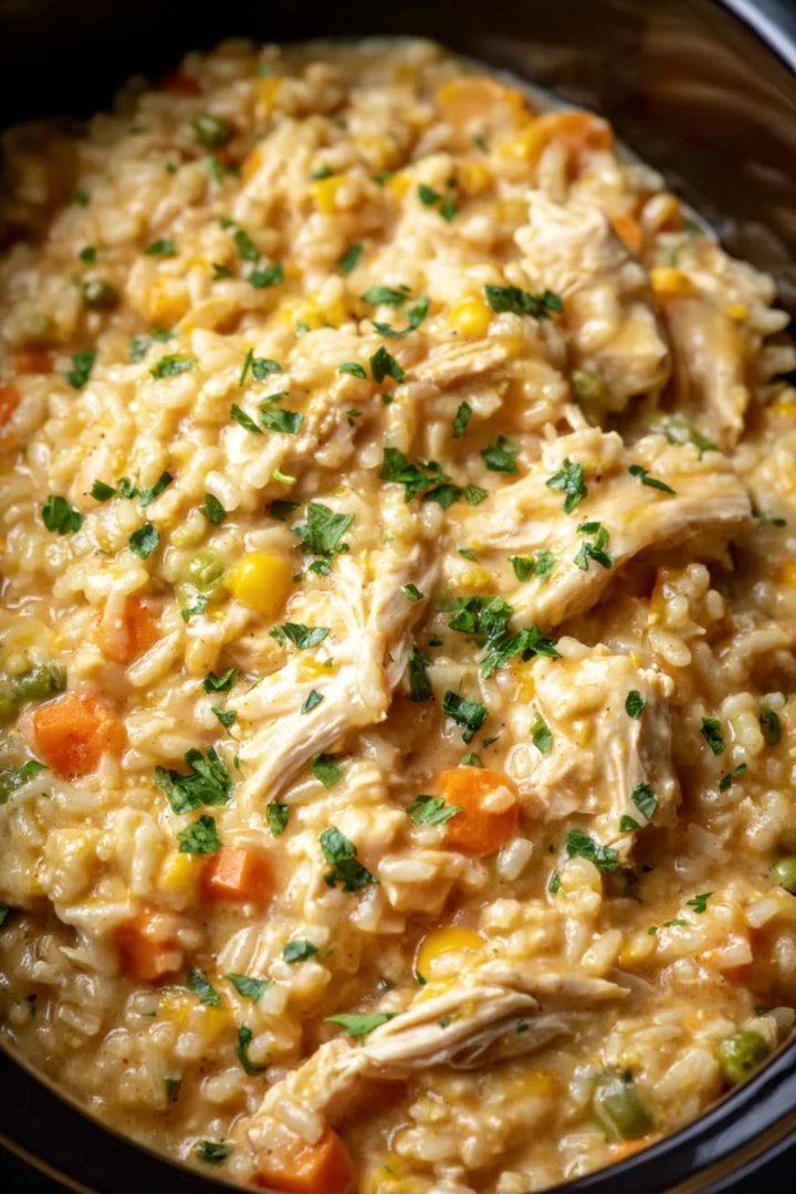 6. **Cook Low and Slow: ** Cover the crockpot and cook on low for 6-8 hours, or on high for 3-4 hours. The chicken should be cooked through, and the rice should be tender.