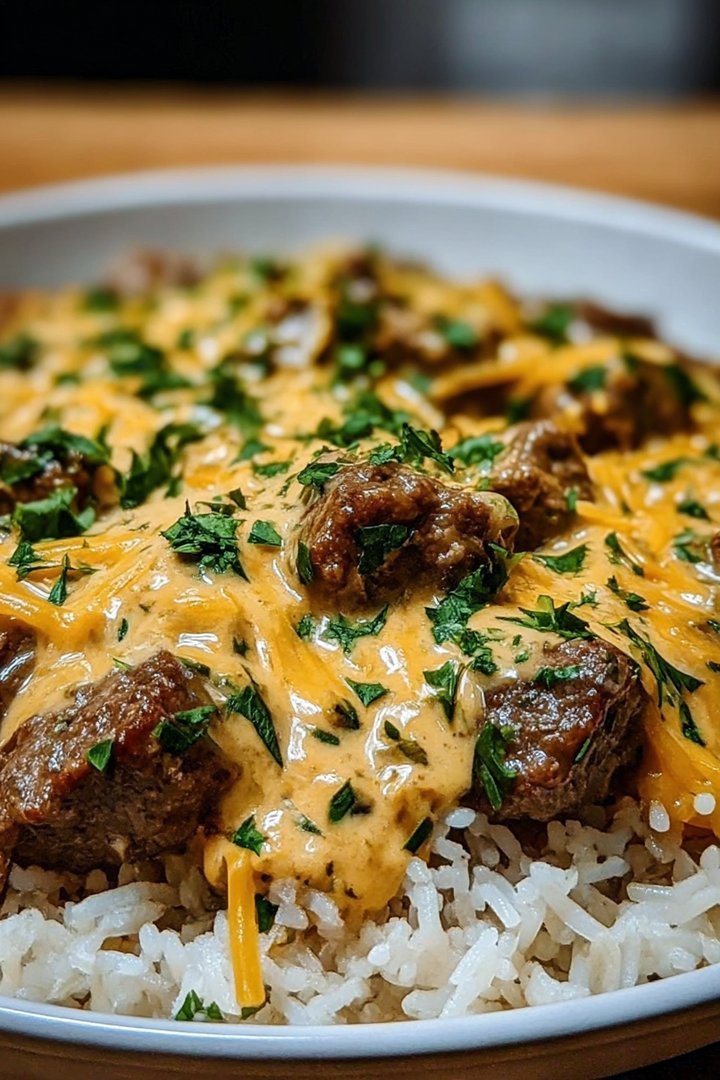 The aroma of savory beef mingling with rich, creamy cheddar parmesan sauce over a bed of fluffy garlic butter rice fills the air, promising an unforgettable meal. It’s a symphony of comfort and flavor, like a warm hug on a chilly evening.