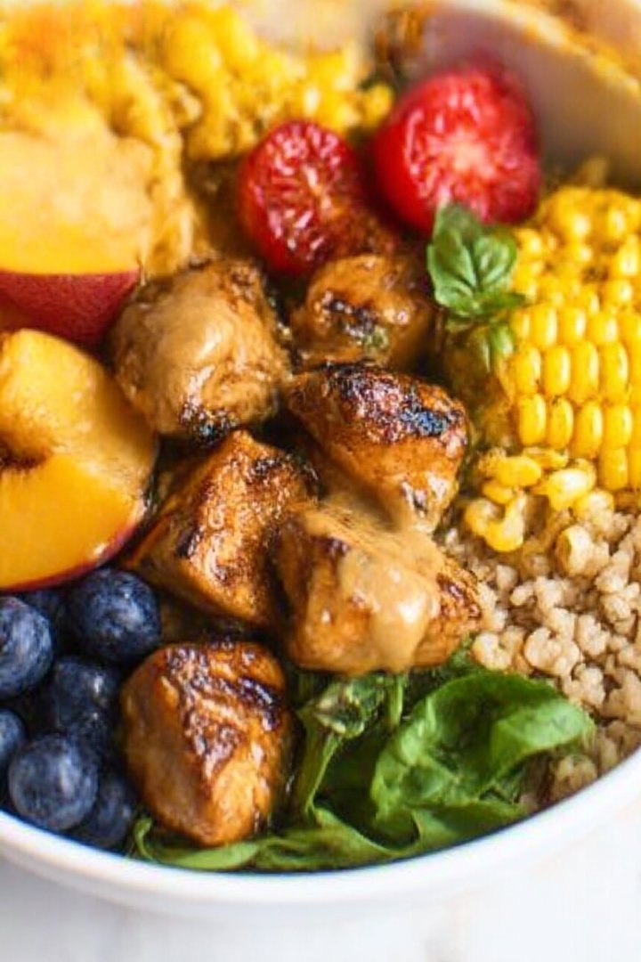 Roasted vegetables like asparagus, broccoli, or bell peppers add a healthy and colorful side dish. The sweetness of the roasted vegetables complements the savory chicken and peaches beautifully.